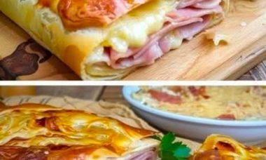 Sastojci:– 1 list lisnatog testa, odmrznut– 200g (7 oz) šunke, isečene na tanke kriške– 200g …
