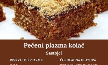 SastojciPotrebno je:2 jajeta1,5 šolja (od 2 dl) šećera2 šolje mleka1 šolja ulja2 kašike slatkog kakaoa1 …