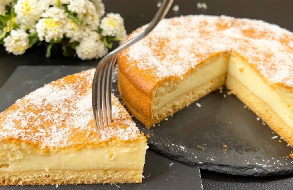 Gornji sloj: prelijte preostalo tijesto za tortu preko sloja kreme, pažljivo ga rasporedite kako biste potpuno prekrili nadjev.