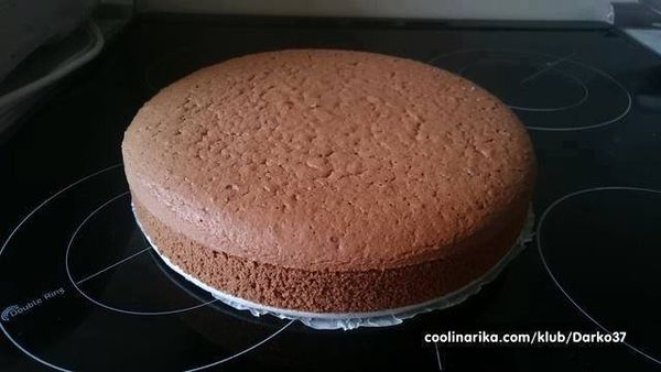 Kalup za tortu obložiti sa papirom za pečenje, uliti biskvit-smjesu i staviti peći u već zagrijanu pećnicu na 160-170 stupnjeva oko 40 minuta.