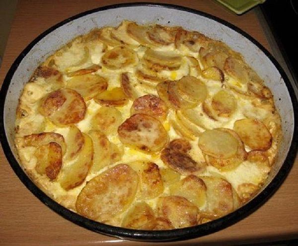 U tepsiju promjera 30 cm složite krumpire i obilato ih premažite kremastom smjesom i popratnim sastojcima. Stavite tepsiju u prethodno zagrijanu pećnicu na 200 stupnjeva i ostavite da se peče otprilike 35-40 minuta. Nakon kratkog vađenja iz pećnice, obilato pospite željenu količinu naribanog sira po vrhu. Vratite posudu u pećnicu na dodatnih 10 minuta kako biste dobili savršeno otopljeni sir.