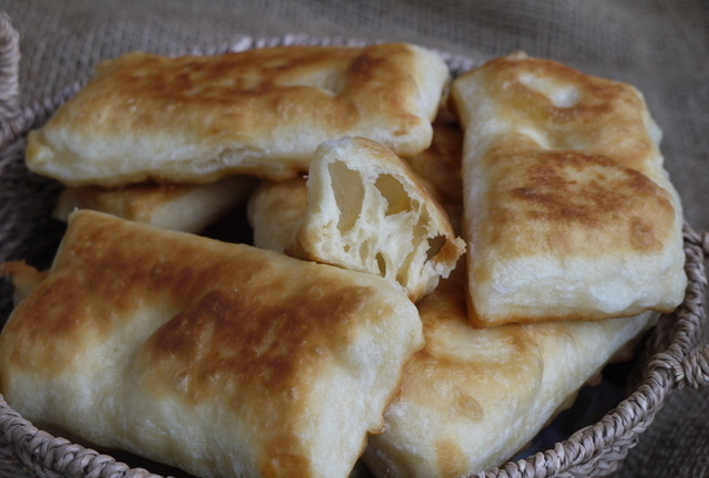 Razviti valjkom na debljinu prsta, isjeći na pravokutnike i pržiti na vrućem ulju.