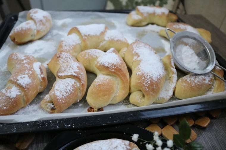 Naraslo testo prebaciti na radnu površinu posutu brašnom, pa razviti oklagijom na pola cm debljine i seći na trouglove. Filovati nadevom od oraha i uvijati u kifle. Ređati u podmazan pleh.