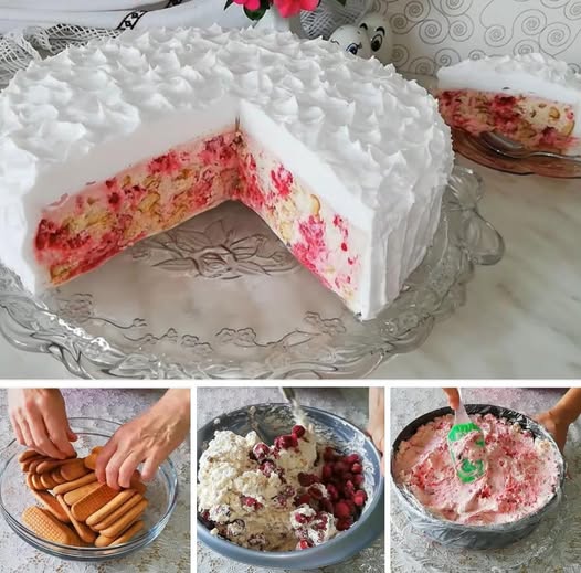 Za pripremu ovog recepta potrebna je pozamašna kutija keksa, voćni sok (kako za namakanje keksa tako i za dodatnu upotrebu po potrebi), 100 grama bijele kreme, 100 mililitara gazirane vode, otprilike 400 grama višanja i žlica griza.