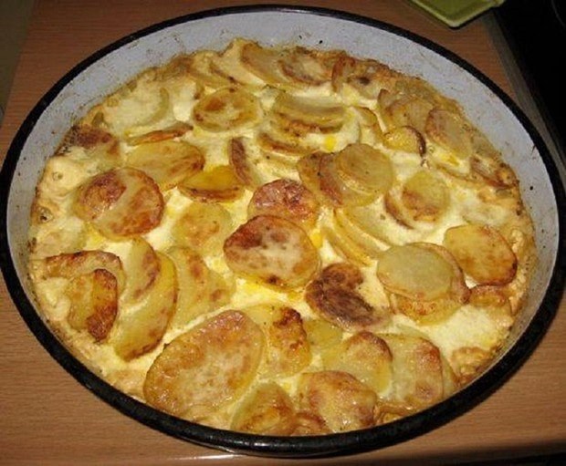 Krompir složiti u tepsiju (promjera oko 30 cm) i preliti pripremljenom smjesom.