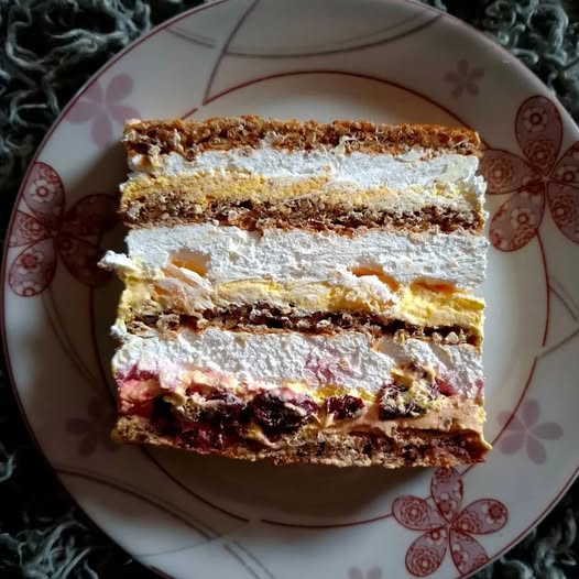 Ovo voće i orašasti plodovi daju torti svežinu i hrskavu teksturu, dok slatka pavlaka donosi lagani kremasti sloj koji savršeno balansira bogatstvo žutog fila.