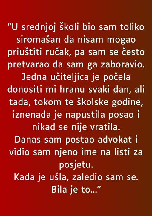 Učiteljica mi je počela svakodnevno donositi hranu; međutim, neočekivano je dala ostavku na svoje mjesto tijekom te akademske godine i nije se vratila. Danas, kad sam krenuo u svoju odvjetničku karijeru, primijetio sam njezino ime upisano među posjetiteljima.