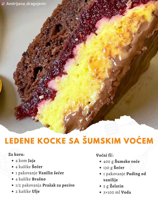 Ledene kocke sa šumskim voćem su omiljeni desert u mnogim domaćinstvima. Ovaj kolač se sastoji od sočne kore, voćnog fila od šumskog voća, kremaste vanil kreme i čokoladne glazure. Njegova priprema je jednostavna, a rezultat je osvežavajući i ukusan desert koji će zadovoljiti svačiji ukus.​