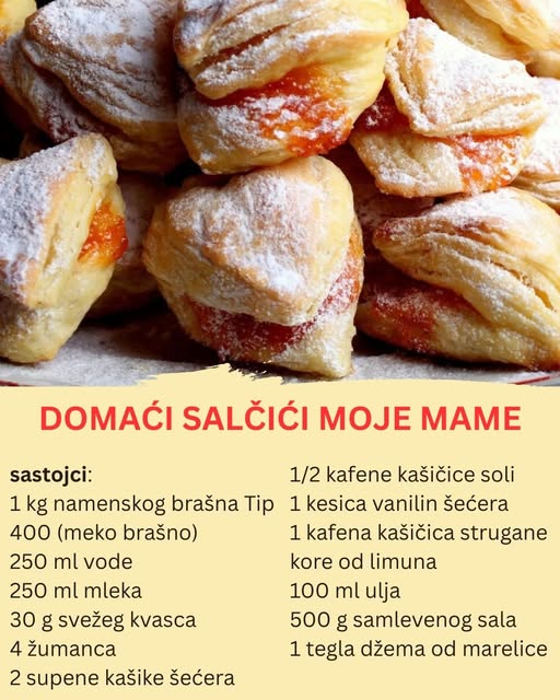 Ako ste ljubitelj domaćih peciva koja mirišu na svežinu i tradiciju, sigurno ćete biti oduševljeni ovim receptom za salčiće sa džemom od marelice. Ovi sočni i mirisni salčići sa bogatim slojem džema i lisnatim testom postali su pravi favorit na mnogim trpezama, bilo da se pripremaju za užinu, slavlja ili kao ukusan prilog uz razna jela.