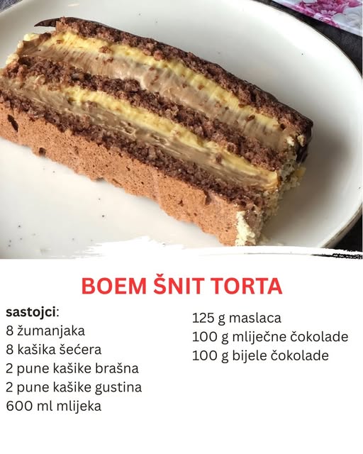 Boem šnit torta je pravo čudo u svijetu poslastica – ona ne traži raskošnu dekoraciju, jer njen ukus i tekstura govore sve. Svojom bogatom aromom lješnjaka, kremastim punjenjem i skladom između dvije vrste čokolade, osvaja sve generacije.