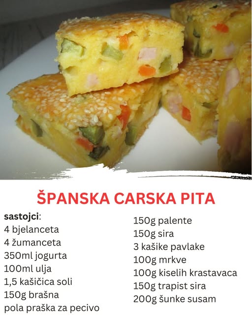 Španska carska pita je zaista specijalitet koji se lako pravi, ali sa bogatstvom ukusa koje pruža, sigurno će oduševiti svakog ko je proba. Sastojci poput palente, mrkve, trapist sira i šunke stvaraju savršen balans između sočnog i hrskavog, slanog i blagih ukusa. Ova pita je idealna za sve prilike – od običnog porodičnog obroka do sofisticiranih večera. Isprobajte je, i sigurno ćete se zaljubiti u njen neodoljivi ukus!