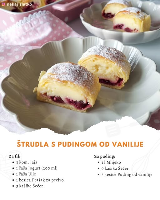 Otvorite vrata slatkom užitku uz ovu jednostavnu i prefinu štrudlu s pudingom od vanilije i višnjama. Savršena za svaki dan ili posebne prilike, a priprema je lakša nego što mislite!