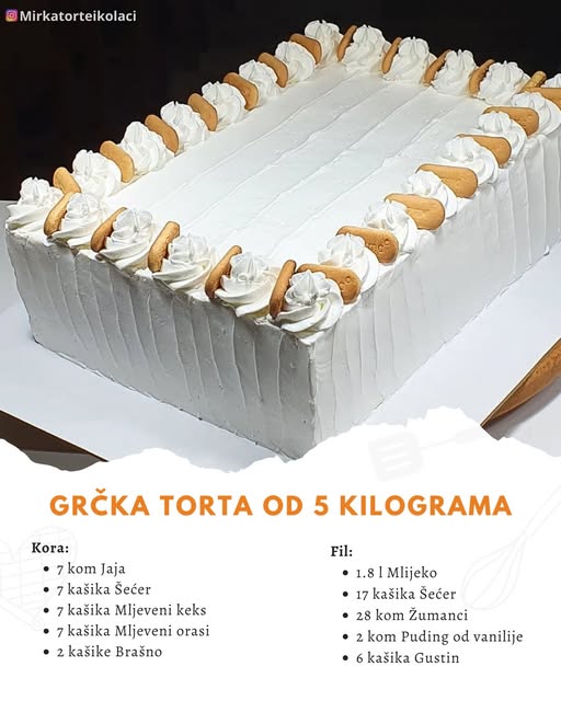 Priprema grčke torte je vrlo jednostavna i brzo ćete uživati u njenom bogatom ukusu. Kremasti fil sa vanilijom i čokoladom savršeno se slaže sa hrskavim korama, a plazma i orasi dodaju posebnu notu. Ovo je savršen recept za veliku tortu od 5 kilograma, idealnu za proslave i rođendane.
