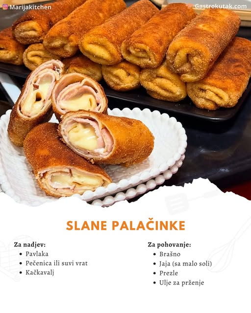 Slane palačinke su ukusan i zasitan obrok koji možete pripremiti za tili čas. Ovaj recept kombinuje hrskavost spolja i sočnost iznutra, zahvaljujući bogatom punjenju od pavlake, pečenice i kavkavalja. Pohovane i pržene do savršenstva, ove palačinke će zadovoljiti i najzahtevnije gurmane.