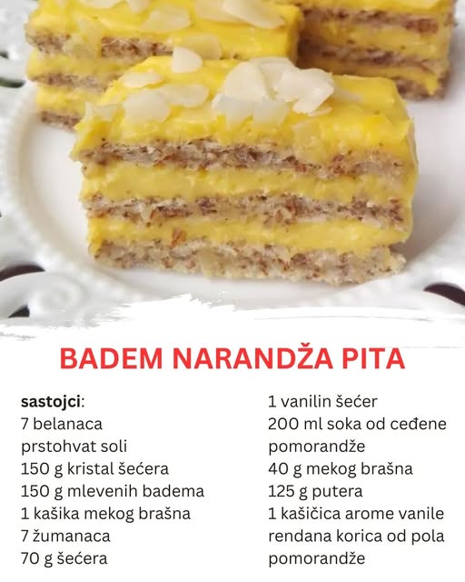 Ovaj kolač sa bademima i kremom od pomorandže je spoj hrskave teksture bademove kore i osvežavajuće kreme, koji će sigurno postati omiljeni desert u vašoj kući. Priprema možda deluje zahtevno, ali svaki korak vodi do neodoljivog rezultata. Krem od ceđene pomorandže daje kolaču svežinu, dok bademi doprinose bogatstvu ukusa.