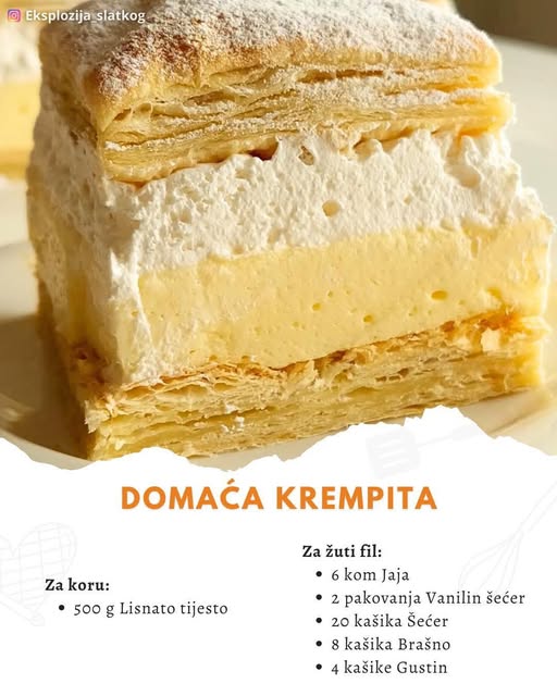 Ovaj recept za domaću krempitu donosi savršen spoj hrskavog lisnatog tijesta i bogatih, kremastih filova. Uz jednostavnu pripremu i nekoliko osnovnih sastojaka, možete uživati u klasičnom desertu koji će očarati vašu porodicu i goste.