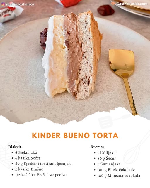 Kinder Bueno torta je spoj mekanog biskvita s hrskavim lješnjacima i kremastim slojevima čokolade, obogaćena ukusom omiljene Kinder Bueno čokoladice.