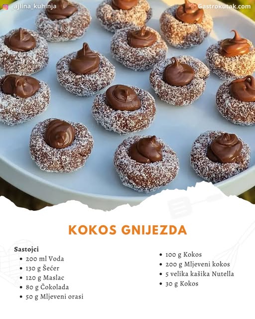 Kokos gnijezda su jednostavan i ukusan desert koji spaja dvije najomiljenije namirnice – kokos i čokoladu. Ovaj recept za kokos gnijezda idealan je za sve ljubitelje brze i jednostavne pripreme, a ujedno i za one koji uživaju u kombinaciji kokos kuglica s čokoladnim punjenjem. Priprema ovog slatkiša neće vam oduzeti puno vremena, a rezultat je zaista neodoljiv!