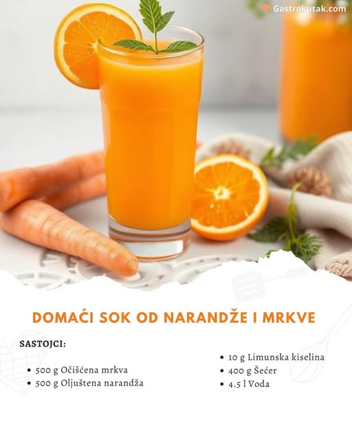 Ovaj osvežavajući domaći sok od mrkve i narandže je savršena kombinacija zdravlja i ukusa. Lako se priprema, bez veštačkih dodataka, i bogat je vitaminima A i C, antioksidansima i prirodnim šećerima.