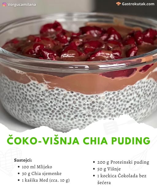 Chia puding je već godinama hit među ljubiteljima zdravih recepata, a ova verzija s čokoladom i višnjama podiže ga na potpuno novu razinu. Chia sjemenke se u kombinaciji s mlijekom i medom pretvaraju u kremasti puding, dok proteinski puding dodaje dodatnu dozu proteina. Upravo to čini ovaj obrok savršenim za doručak, užinu ili lagani desert. Osim što je ukusan, ovaj recept je i odličan izbor za one koji prate fitness ishranu ili žele smanjiti unos rafiniranog šećera, jer se zaslađuje prirodnim sastojcima.