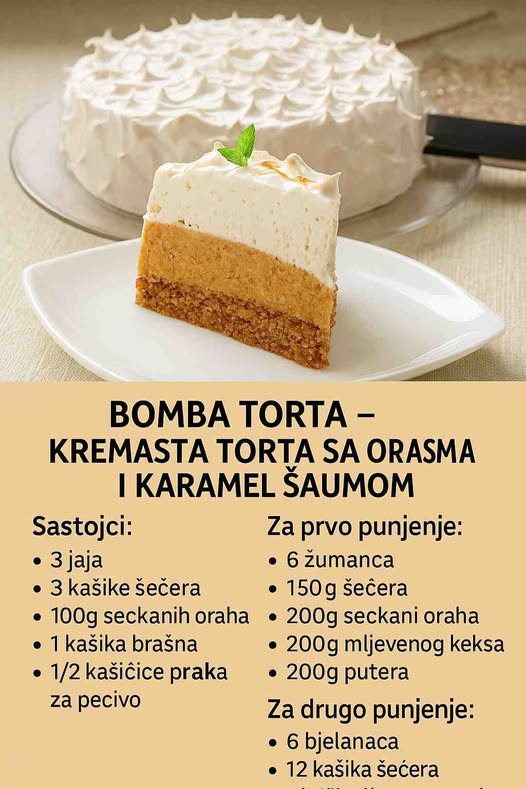 Bomba torta – Krem torta sa orasima, keksima i karamel šaumom. Delikatna krem torta sa orasima, keksima i karamel šamom. Veoma je ukusna i jednostavna za pripremu, a dosta je velika pa se može koristiti i za proslave.