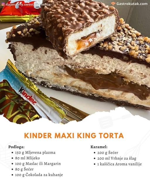 Kinder Maxi King torta je pravi raj za ljubitelje čokolade, karamela i kremastih deserata. Ova domaća verzija popularnog slatkiša donosi bogatstvo okusa u svaki zalogaj.