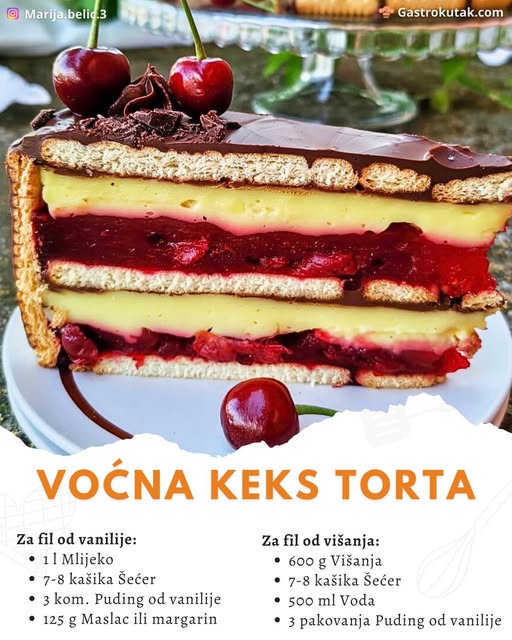 Brza voćna keks torta je savršen desert za sve koji vole jednostavne, a ukusne poslastice. Ovaj recept bez pečenja spaja hrskavi petit keks s bogatim filovima od višanja i vanilije, a prelivena je toplom čokoladom koja dodaje poseban šarm. Idealna je za ljetne dane kada ne želite provoditi puno vremena u kuhinji.