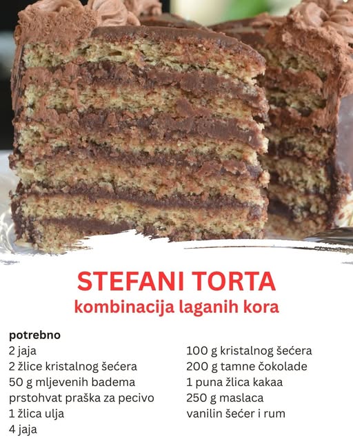 Stefani torta nije običan desert. Ona je prava kombinacija sofisticiranosti i jednostavnosti, bogata okusa i teksture. Sastavljena od mljevenih badema, tamne čokolade, bogatog maslaca i kakaa, ova torta je pravi užitak za sve ljubitelje slatkiša. Njen kremasti fil i glatki ganache čine svaki zalogaj posebnim, dok lagane kore, koje se prže s bjelanjcima i badema, daju torti savršenost.