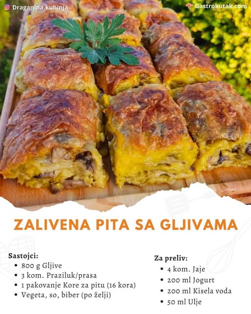 Ovaj recept je prava stvar za one koji žele nešto ukusno, a opet lako i brzo za pripremu. Savršen je za svakodnevne obroke, ali i za iznenadne goste. Isprobajte zalivenu pitu sa gljivama i uživajte u njenim fantastičnim okusima!