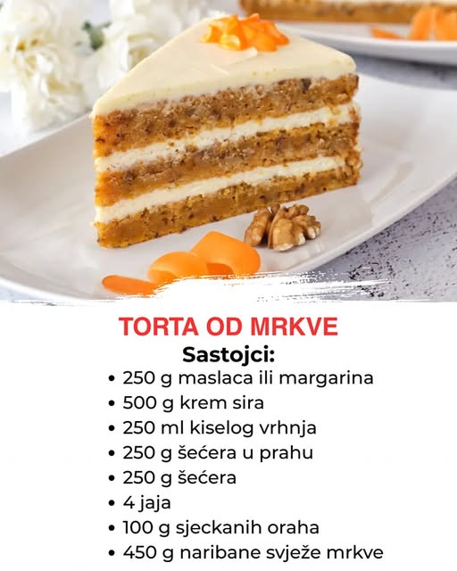 Torta od mrkve možda zvuči neobično onima koji je nikada nisu probali, ali jednom kad zagrizeš – postaješ fan zauvijek. Mekana, sočna i puna mirisa cimeta, orašastih plodova i bogate kreme, ova torta je savršen balans između jednostavnog kolača i fine slastice za posebne prilike.