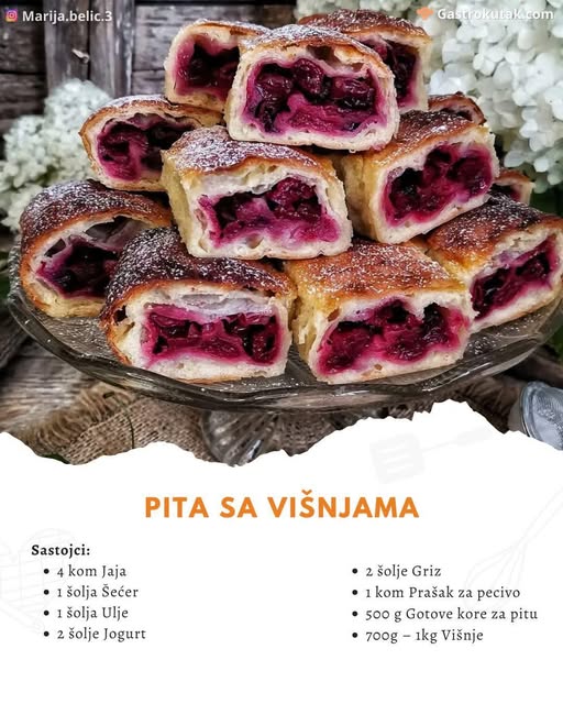 Ovaj recept za pitu sa višnjama jednostavan je, brz i savršen za ljubitelje voćnih pita. Sočne višnje u kombinaciji sa mekim, hrskavim korama čine savršen desert koji oduševljava svojom sočnošću i ukusom.