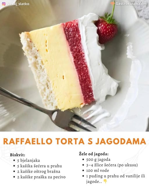 Iako je recept precizan, Raffaello torta se lako može prilagoditi. Ako nemaš svježe jagode, možeš koristiti maline, višnje ili čak miks šumskog voća. Umjesto šlaga, neki biraju mascarpone ili laganu kremu od slatkog vrhnja. Tako se isti recept može interpretirati na više načina, a svaki put dobiješ vizualno efektan i ukusan rezultat koji odgovara sezoni i prigodi.