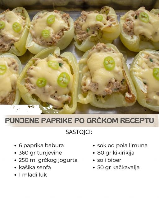 Uzmite paprike, presecite na pola, stavite u pleh i pecite u rerni na 220 c oko 20 minuta. Za to vreme napravite nadev. Pomešajte tunjevinu, grčki jogurt, senf, mladi luk, sok od limuna i kikiriki. Posolite i pobiberite. Nadevajte paprike, na kraju dodajte rendani kačkavalj, i zapecite još 5 minuta na 220c.