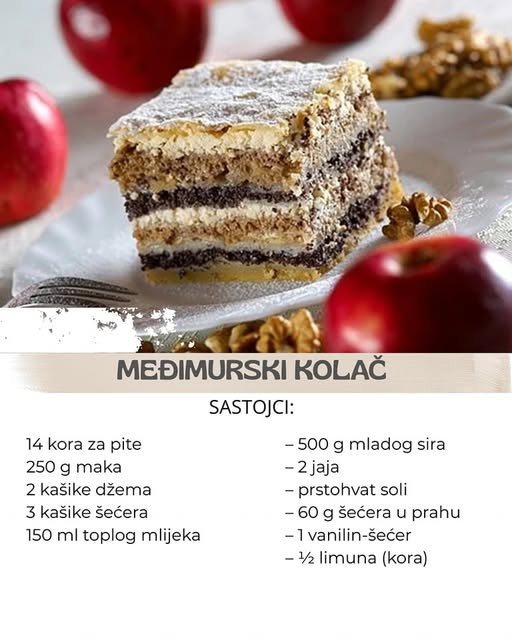 Pripremljene kore premazati polovinom fila od maka. Ravnomjerno rasporediti i blago utisnuti. Zatim, nanijeti još dve kore za pite i svaku premazati rastopljenim puterom.