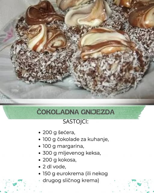 Na sredini svakog napraviti malo ulegnuće. Uvaljati gnijezda u kokos, a u ulegnuće dodati po žličicu eurokrema.