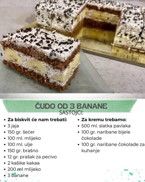 Fantastičan kolač sa 3 banane i čokoladom je svima pristupačan, a odličan recept koji često spremim.