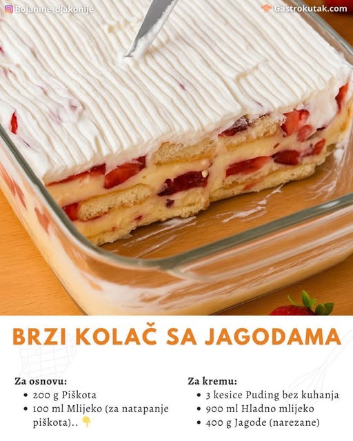 Ako tražiš savršen recept za brzi, kremasti i voćni desert – ovaj kolač sa jagodama će ti postati omiljeni! Priprema se bez pečenja i gotov je za svega 10 minuta, što ga čini idealnim kada ti treba nešto slatko, a nemaš puno vremena. Kombinacija mekanih piškota, lagane kreme od pudinga i svježih jagoda stvara slojeviti desert koji osvježava i oduševljava svakim zalogajem.