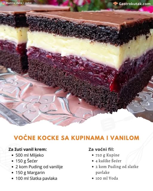Ove voćne kocke sa kupinama i vanilom idealan su desert za sve ljubitelje kremastih i voćnih kolača. Sočna čokoladna kora, bogat vanil krem i osvježavajući voćni fil od kupina čine ovu poslasticu neodoljivom. Priprema je jednostavna, a rezultat uvijek uspješan.