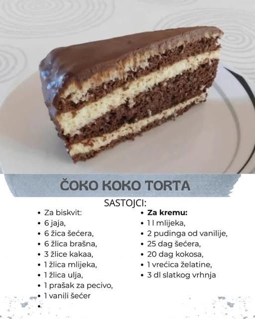Na natopljenu biskvitnu koru redajte kremu od kokosa pa biskvit pa kremu i na kraju treću biskvitnu koru.Na kraju preliti tortu čokoladnom glazurom koju pripremite na sljedeći način:.Na pari otopite čokoladu i margarin. U otopljeno dodajte vrhnje te neka se dobro sjedini. Paziti da ne zakuha. Pričekajte da se malo prohladi i prelijte tortu.