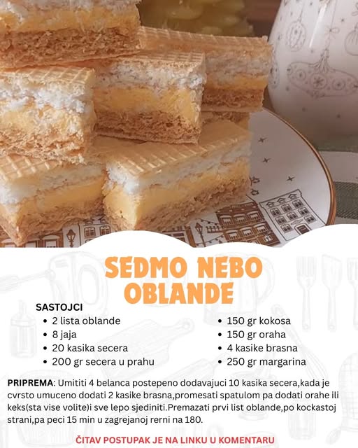 Sedmo nebo oblande nisu slučajno dobile svoje ime. Ovaj recept je proveren klasik koji se prenosi generacijama i uvek izaziva oduševljenje. Kombinacija hrskavih oblandi, penaste kore od belanaca sa orasima i kokosom, i bogatog žutog krema od žumanaca stvara savršen balans tekstura i ukusa.