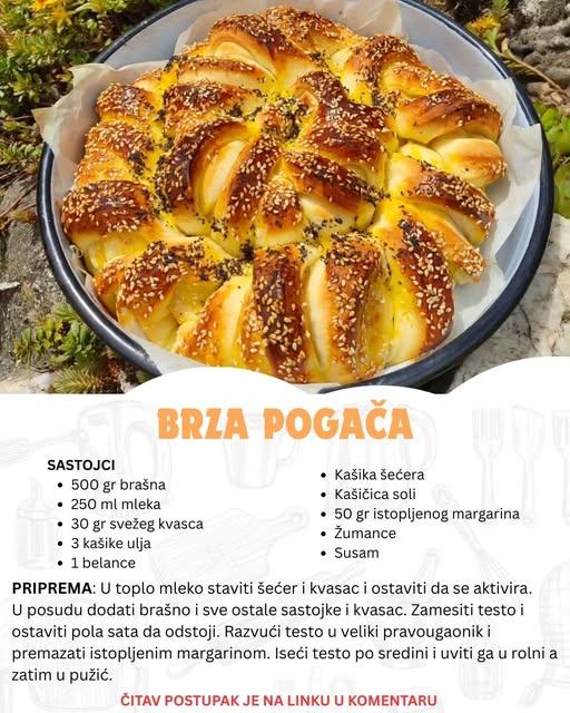 Ovaj recept ne zahteva mnogo sastojaka, niti specijalne tehnike, a ipak će vas osvojiti svojim bogatim ukusom i mirisom koji će se širiti kuhinjom dok se peče. Brza pogača je idealan izbor za doručak, užinu ili čak kao prilog uz glavno jelo, i savršeno će se uklopiti sa domaćim namazima, sirom, ili čak hladnim mesom.