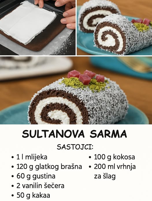 Isecite na komade pravougaonog oblika, pa svaki komad urolajte. Svaku “sarmu” još malo uvaljati u kokos koji je ispod i posuti još kokosom po želji. Čuvati u frižideru do služenja ili odmah služiti.
