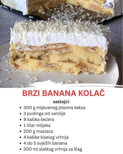 Kada poželimo nešto brzo, kremasto i osvježavajuće, a opet dovoljno zasitno da zamijeni i najsočniju tortu, onda je kolač sa bananama i keksom pravi izbor. Kombinacija voćne svježine, bogate vanilin kreme i nežno lomljenih keksa čini ovaj desert savršenim za svaku priliku – bilo da je riječ o nedjeljnom ručku, slavlju ili jednostavno trenutku kad poželite da sebe i svoje najdraže počastite nečim posebnim.