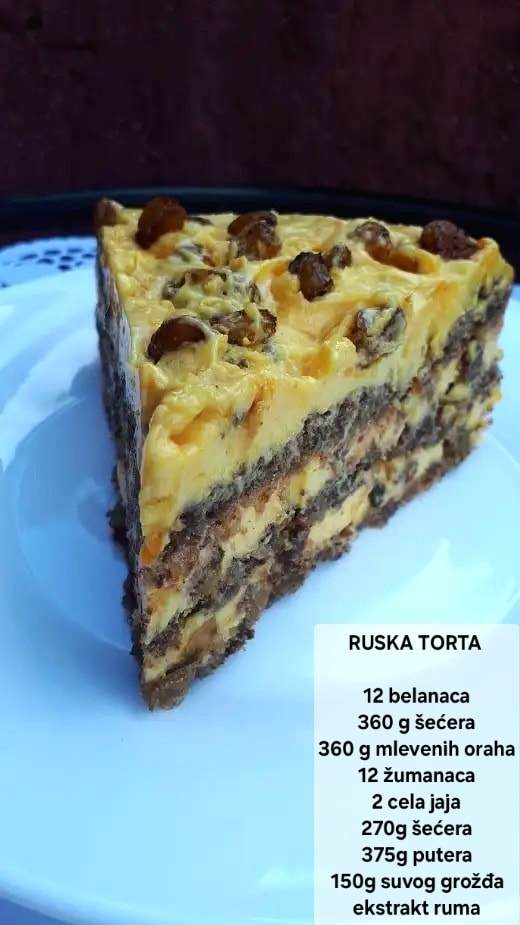 Za svaku koricu umutiti u čvrst šam po 4 belanaca i 120g šećera, pa dodati i umešati varjačom 120g samlevenih oraha.