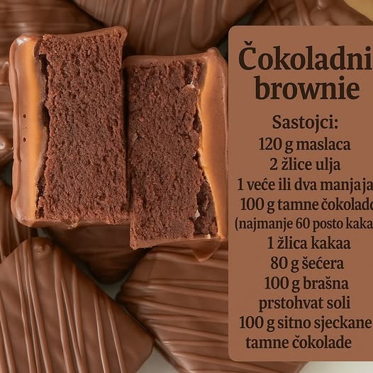 Čokoladni brownie – priprema:Jaja i šećer dobro umutiti pa dodati maslac sobne temperature. Čokoladu otopiti na pari pa dodati smjesi i sve umutiti mikserom.Posebno pomiješati suhe sastojke, dodati ih prethodno umućenoj smjesi pa kratko umutiti mikserom.