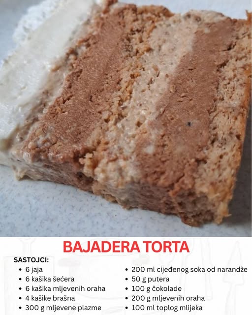 Kao i kod većine složenih torti, i za bajaderu je neophodno pažljivo pratiti sastojke. U nastavku ćemo navesti sve potrebne sastojke za svaki deo torte: