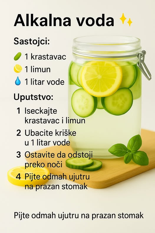 Dodajte krastavac i kriške limuna u čistu staklenu teglu. Prelijte s 1 litrom vode.