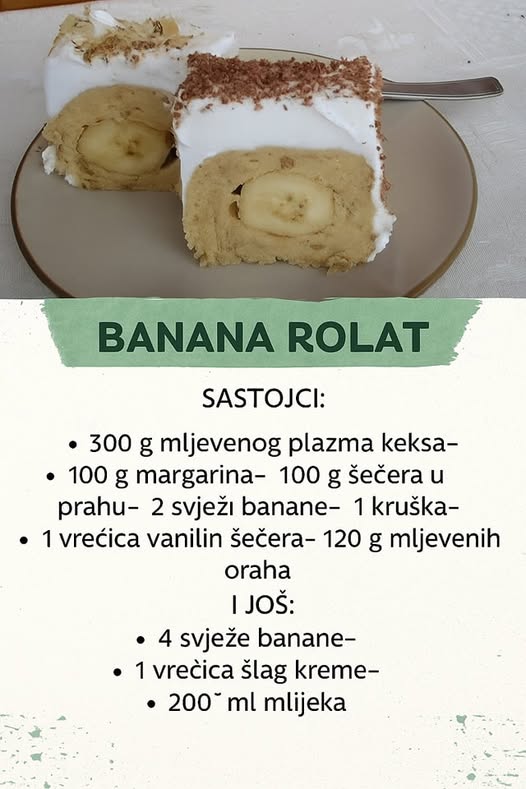 Zatim dodati mljeveni plazma keks, vanilin šećer i orahe. Na foliju razvaljati smjesu, poredati banane uzdužno, zarolati i ostaviti na hladno da se stisne. Ohlađene rolne dekorisati umućenom šlag kremom!