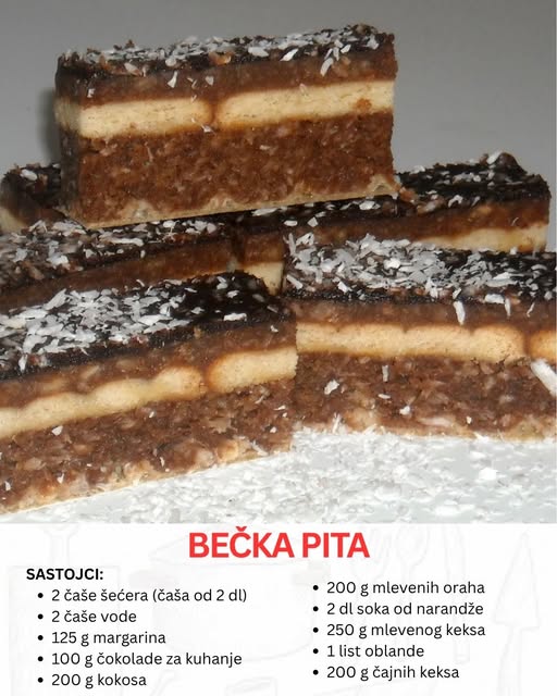 Bečka pita je jedan od onih kolača koji već pri prvom zalogaju izaziva osmijeh i nostalgiju. Spoj bogatog fila, aromatične čokolade, oraha i kokosa, upotpunjen hrskavim slojem keksa, pravi je klasik koji nikada ne izlazi iz mode. Zovu je i “kraljicom bez pečenja”, jer u svega nekoliko koraka možete dobiti elegantnu i raskošnu poslasticu, idealnu za praznike, rođendane ili kad god poželite da zasladite dan.