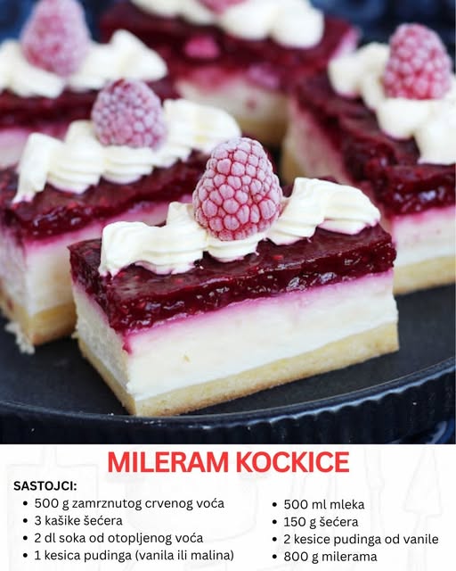 U svetu slatkiša, postoji jedna posebna poslastica koja kombinuje mekoću testa, bogatstvo krem kreme i sočno voće iznad svega! Pred vama su mileram kockice – dekadentno, a istovremeno osvježavajuće, pravo savršenstvo za svaki slatki obrok. Ovaj kolač spaja jednostavne sastojke poput milerama i pudinga s voćem koje mu daje završni hit efekt. Idealno za velike proslave, prijateljske okupljanja ili trenutke kada želite da se počastite na najbolji mogući način.